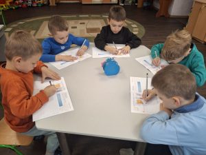 Мета: продовжувати формувати вміння дітей рахувати предмети в межах 5 і позначати їх цифрами; удосконалювати вміння дітей порівнювати дві групи предметів (множини), використовуючи поняття “більше”, “менше”, “порівну”; вправляти вміння дітей працювати в зошиті, правильно тримати олівець, проводити лінії за зразком.